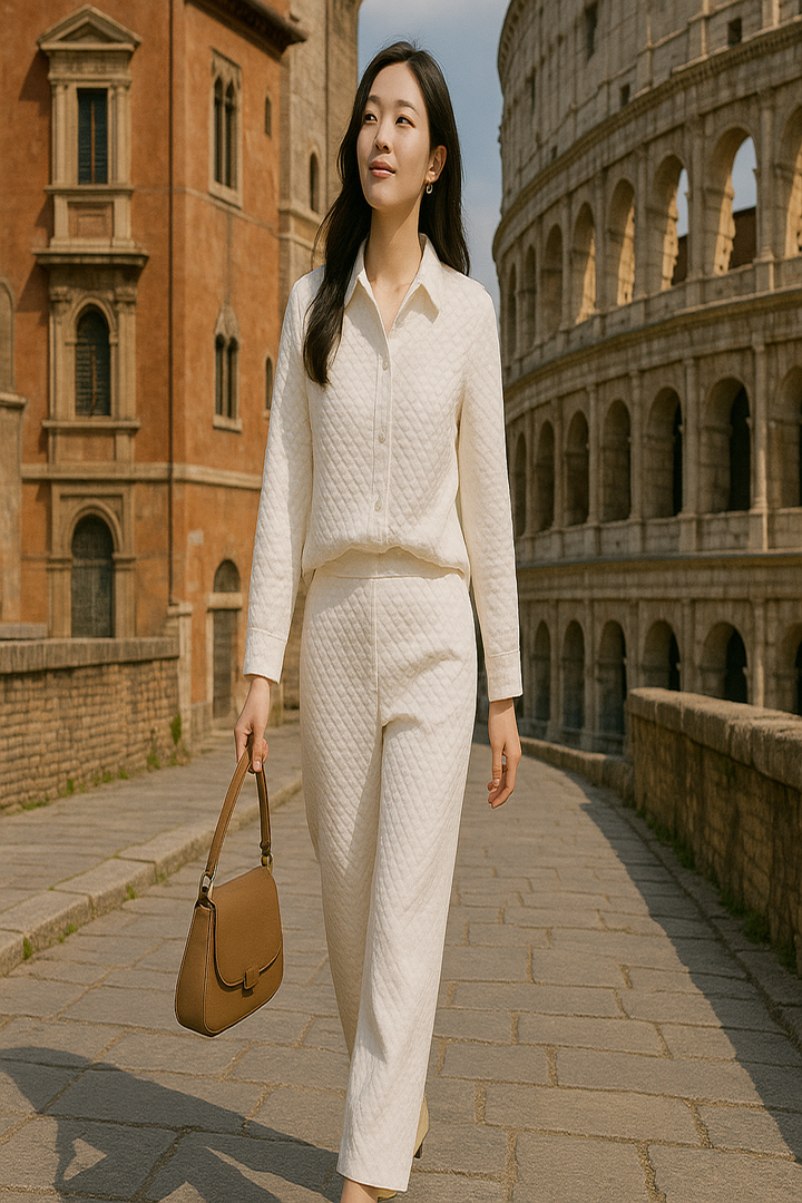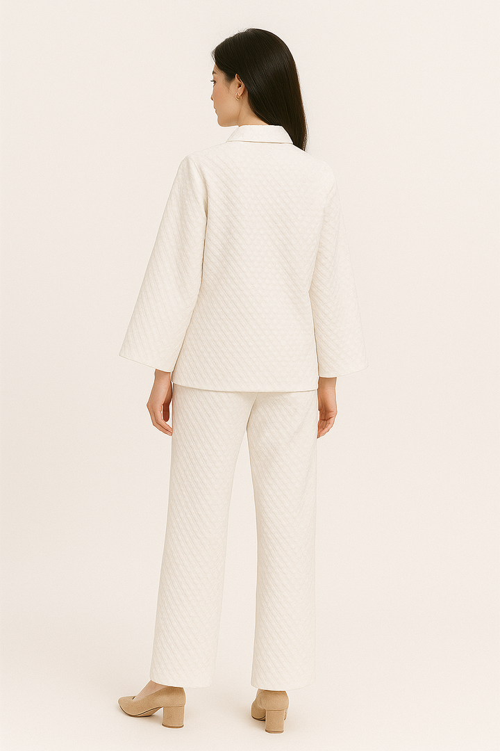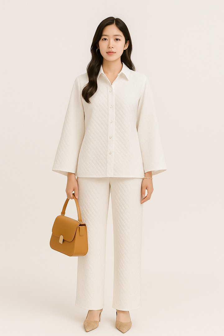 Embrace timeless elegance with the Ivory Grace Coord Set, crafted from breezy textured crinkle fabric that moves with you. Designed for the modern muse, this lightweight two-piece set features a relaxed button-down shirt with loose, airy sleeves and coordinating wide-leg trousers that offer both structure and fluidity.Whether you're strolling through sunlit streets or lounging in quiet luxury, this set effortlessly transitions from day to evening. Style it with gold accents and neutral accessories for a clean, elevated look.