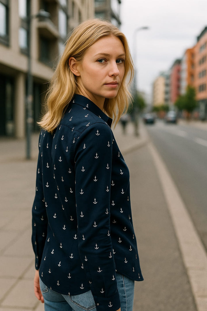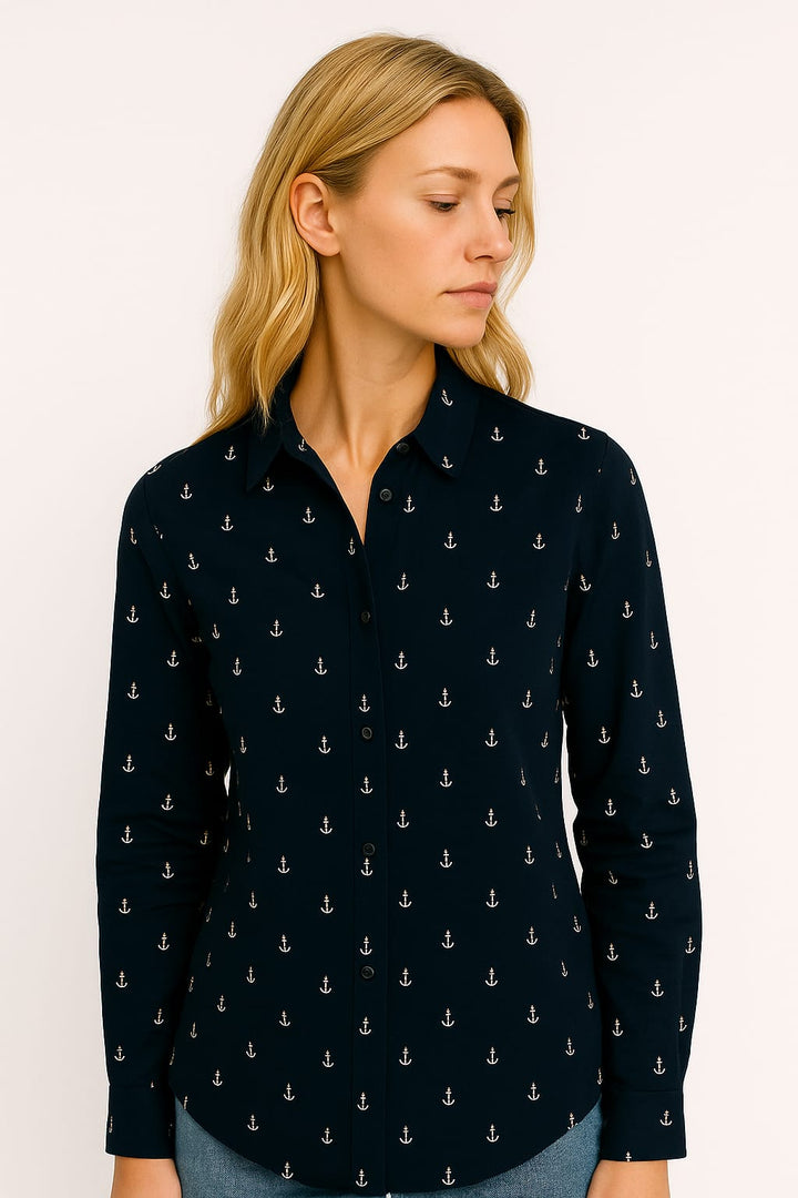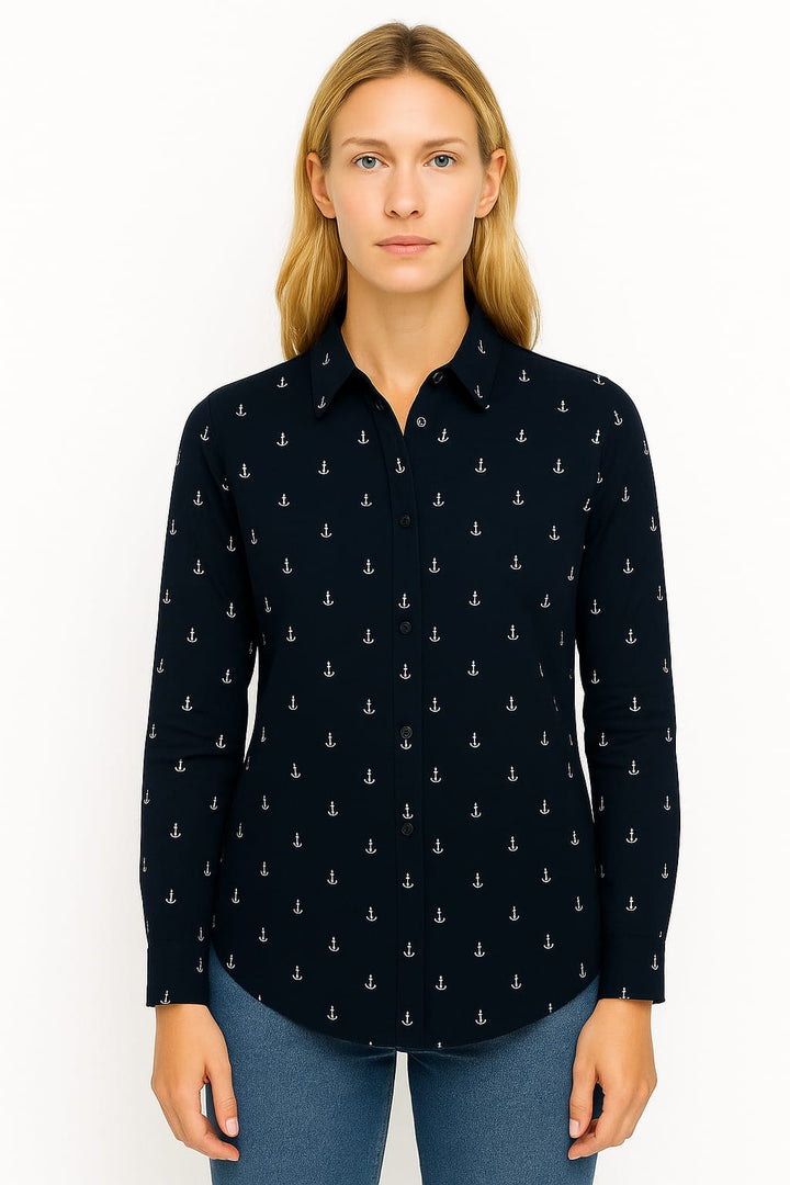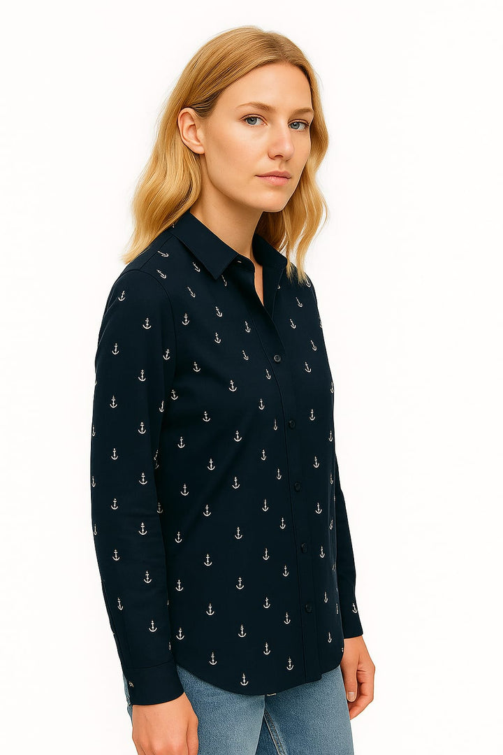 Set sail in style with the Marina Classic, a navy anchor-print shirt designed to bring effortless elegance to everyday looks. Featuring a relaxed yet tailored fit, soft cotton fabric, and a crisp button-down silhouette, this piece pairs perfectly with skirts, denim, or as a statement layering item.