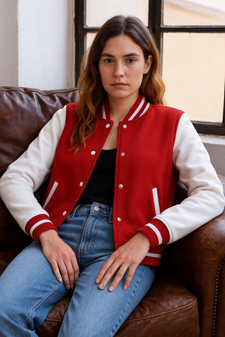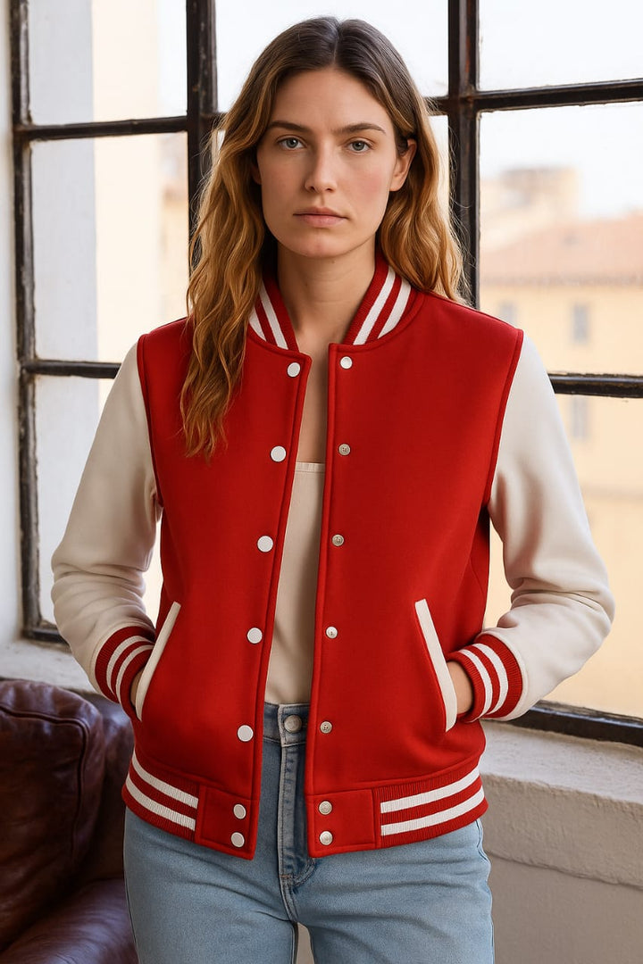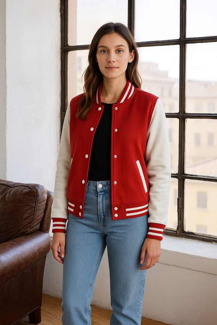Red & White Women’s Varsity Jacket – Sporty, Stylish & Comfy